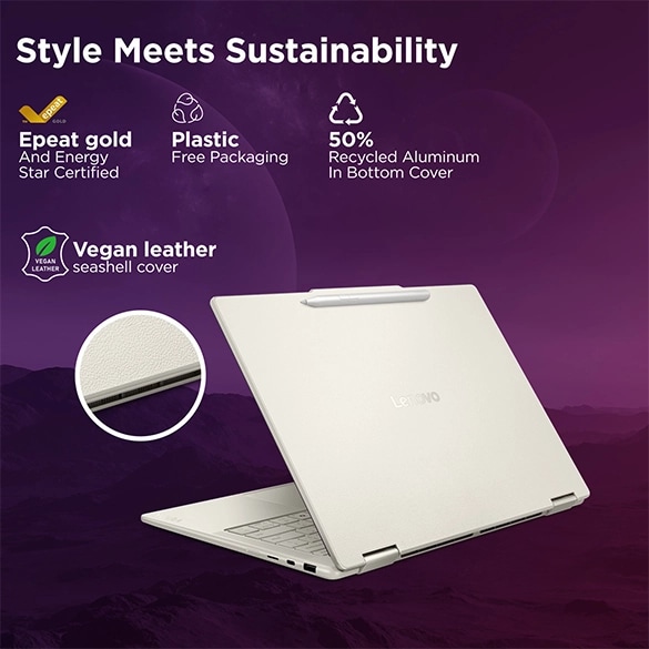 The ENERGY STAR® rated, and EPEAT® Gold-registered* Yoga 7i 2-in-1 14″ achieves plastic-free packaging. All paper boxes used in packaging is FSC™-certified and made from other controlled material.** It’s built with 50% recycled aluminum in the bottom cover and 90% post-consumer recycled plastic in the power adapter case.