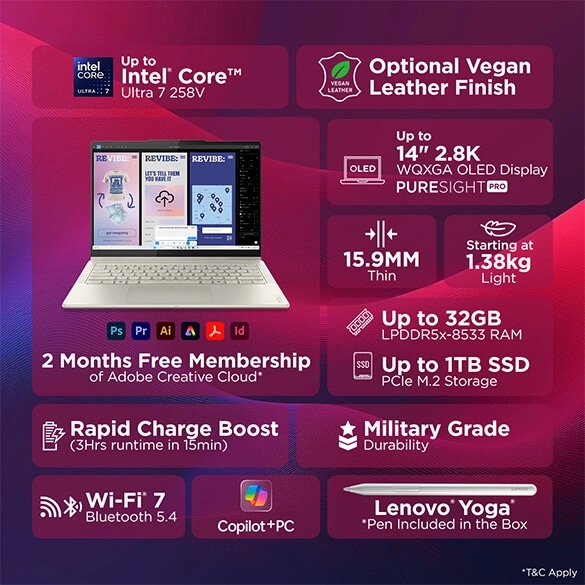 Bring ideas to life with AI-powered creative tools that help you find your flow. Lenovo Smart Note launches instantly and features an audio bookmark for precise review. Microsoft Cocreator enhances collaboration, and with a 2-month Creative Cloud trial, explore 20+ Adobe apps.