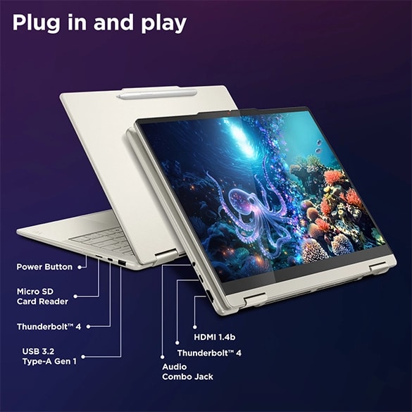 Supercharge your creativity with the Yoga 7i 2-in-1, powered by Intel® Core™ Ultra 7 Evo Edition processors and a 40+ TOPS NPU. This AI-driven powerhouse keeps it all running smooth and fast, so you can work, create, and design without a hitch. Cooler, quieter, and built for all-day action, this next-gen AI elevates your creativity wherever you go.