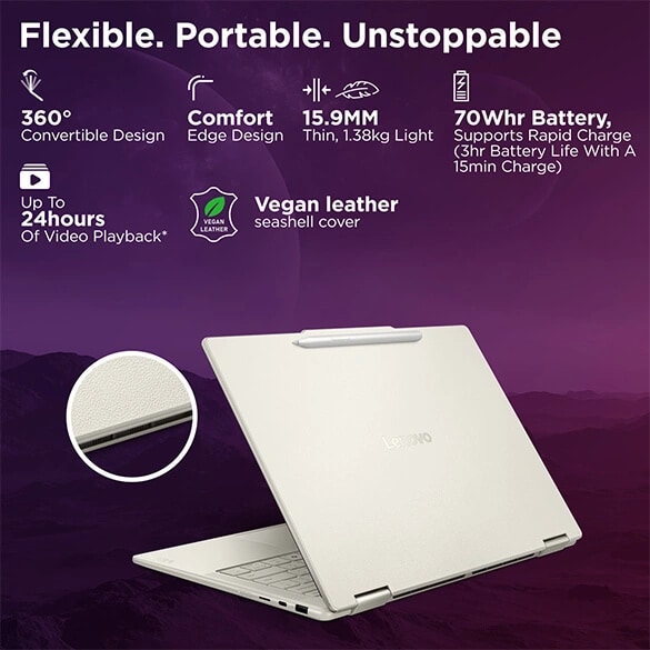 Switch things up with the Yoga 7i 2-in-1. Its 360° design easily transitions between laptop, tablet, and tent modes, perfect for sketching, editing, or presenting. The responsive touchscreen and optional Yoga Pen deliver precise control and seamless navigation.